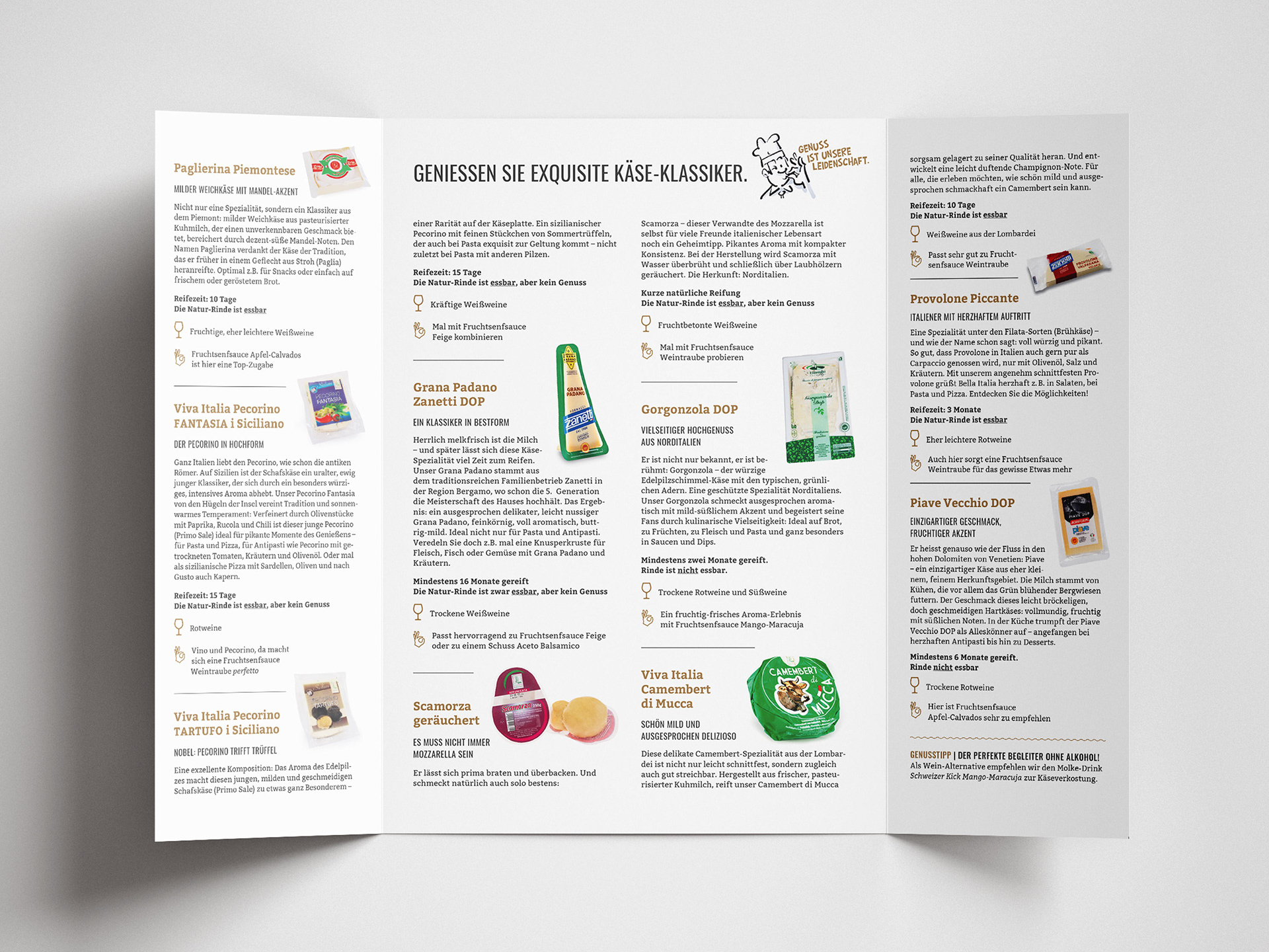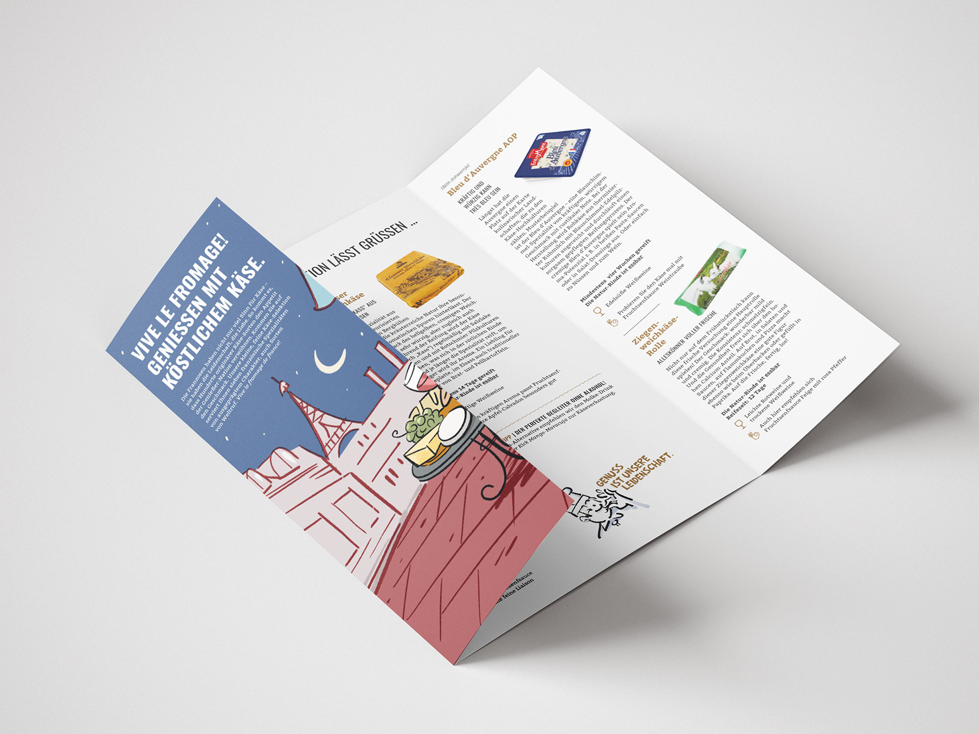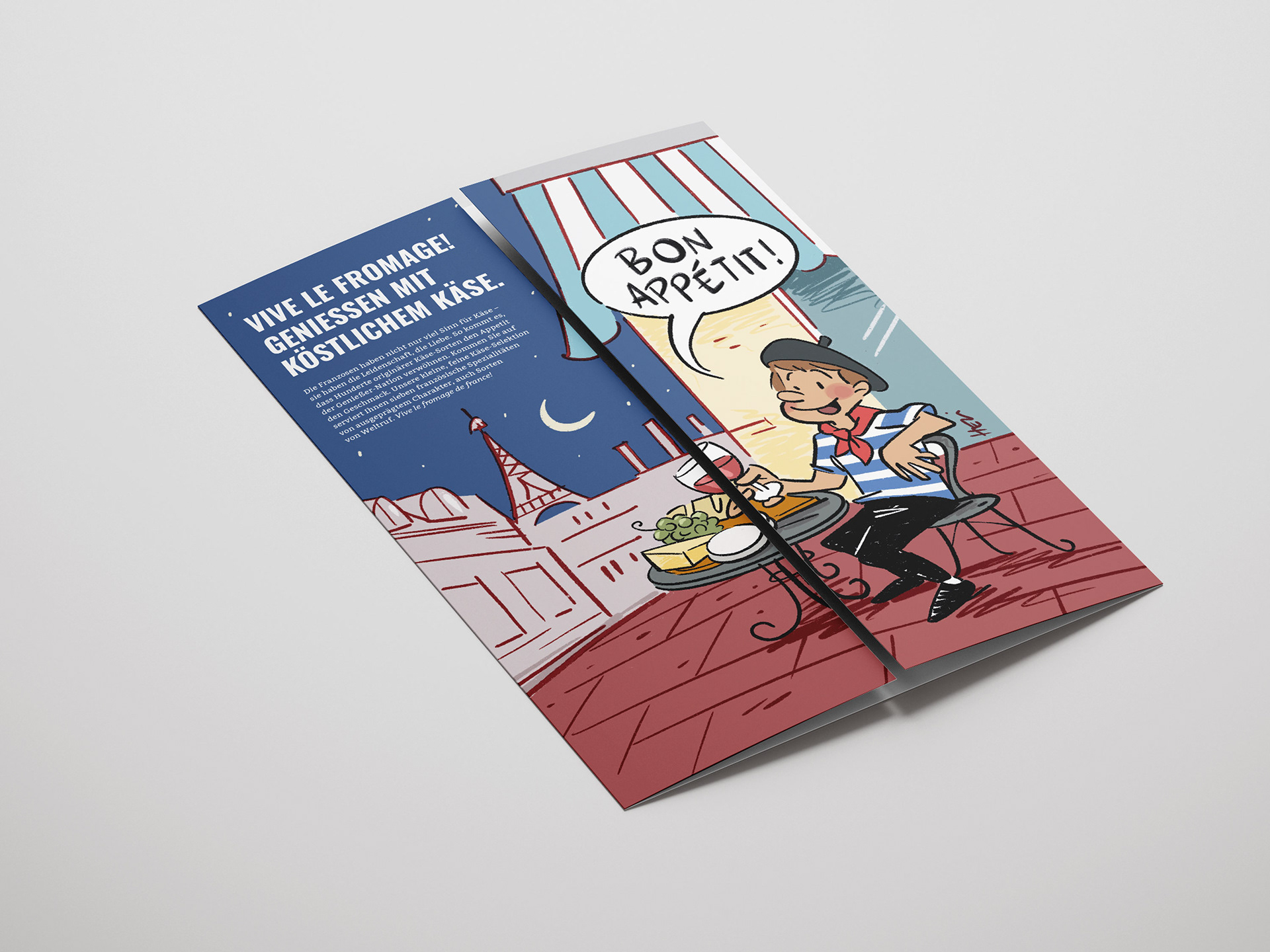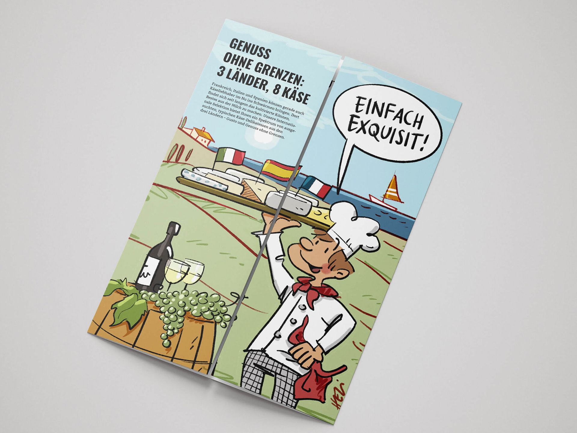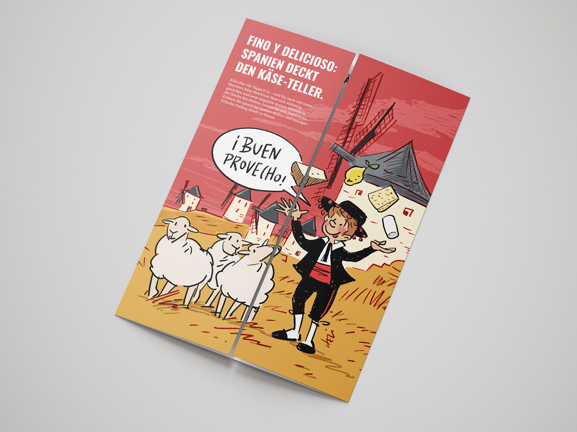 Feinste Käseselektionen aus Frankreich, Italien und Spanien suchten adäquate Beileger. Illustration und Satz by Henning, Texte: Hans Josef »Yussuf« Birker