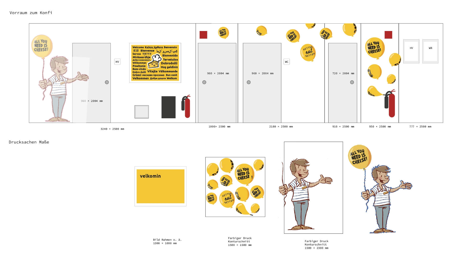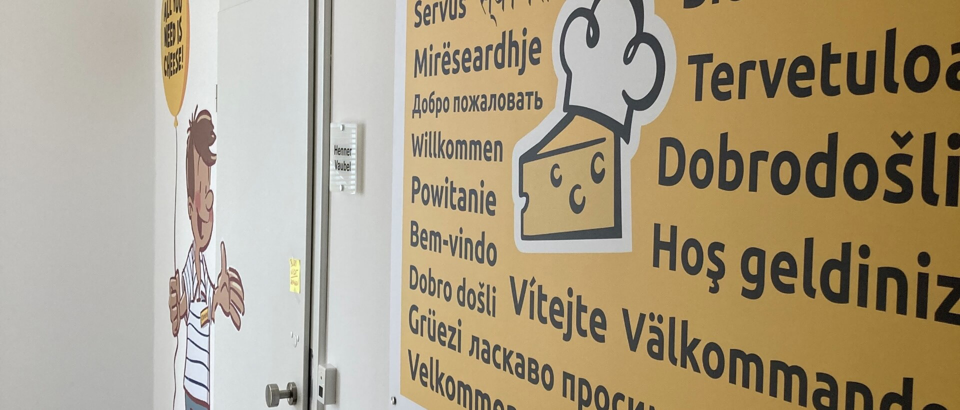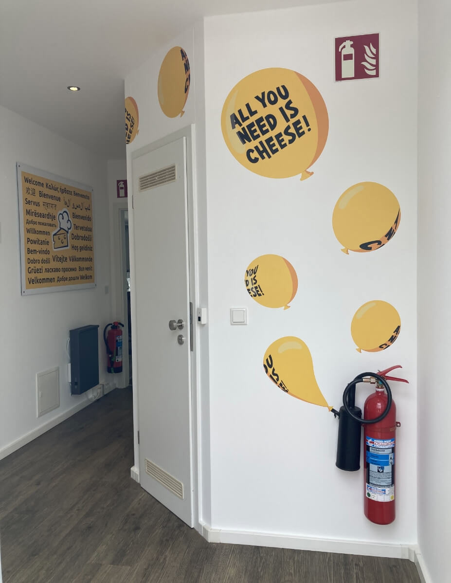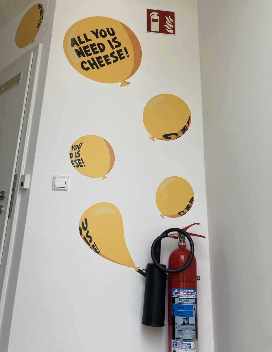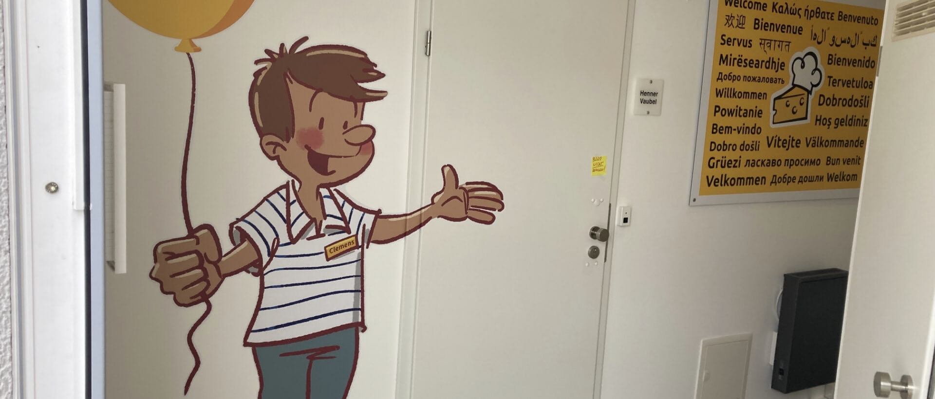 Aus einem Gag mit einem Feuerlöscher ist eine komplette Neugestaltung des Eingangsbereiches zum Konferenzraum der Firma Müller-Moers geworden. Firmenmaskottchen Clemens bittet herein – und das gleich in 26 Sprachen!