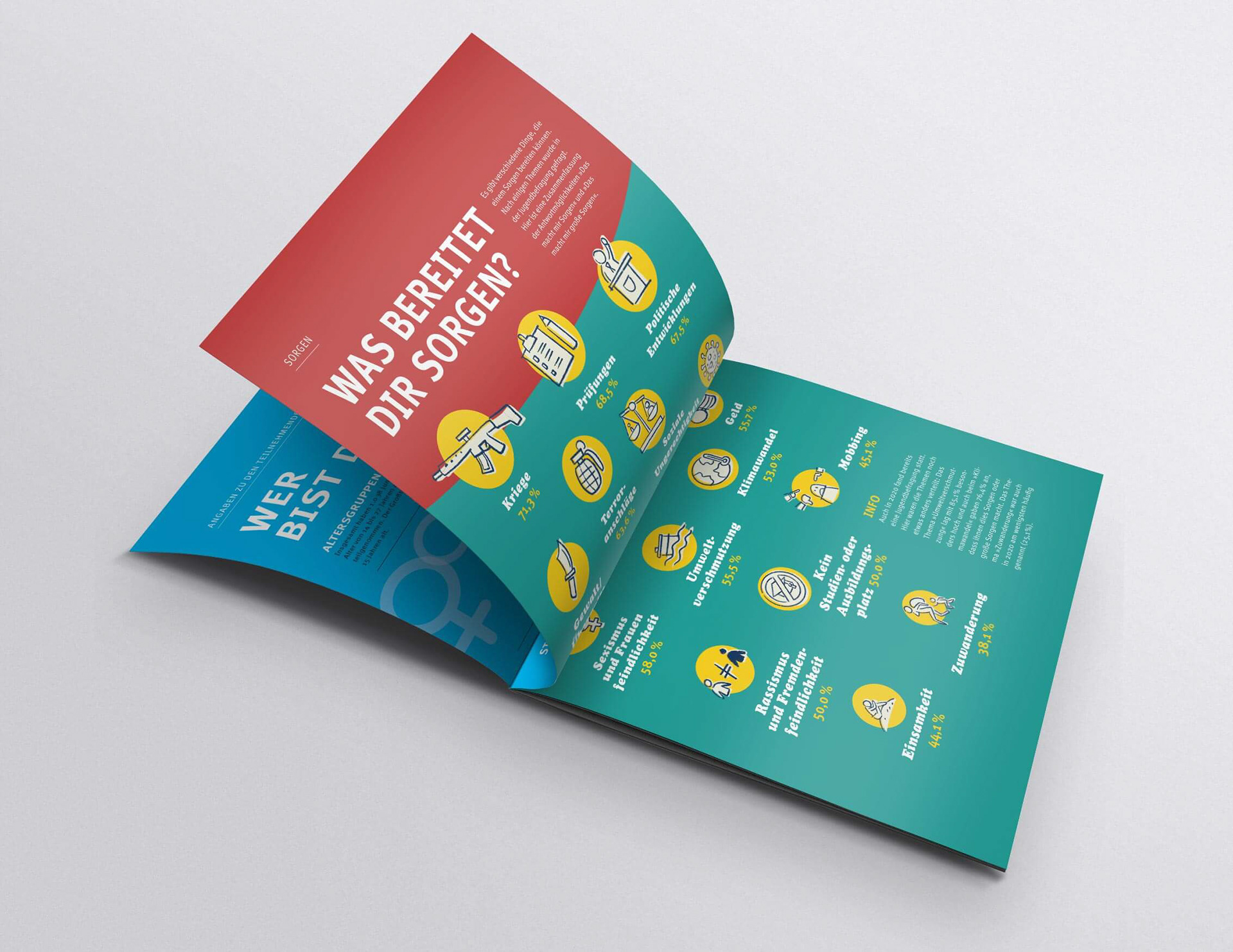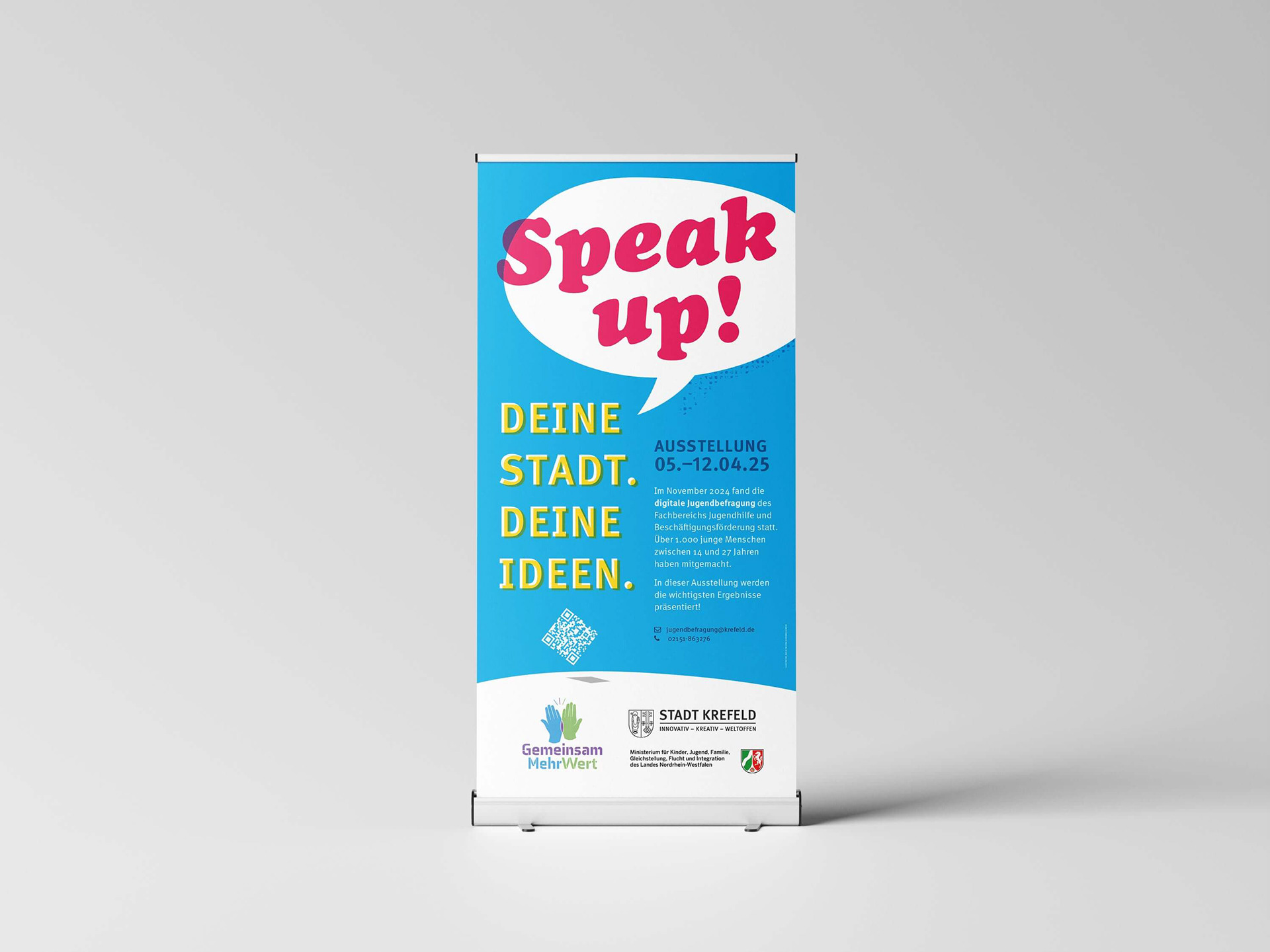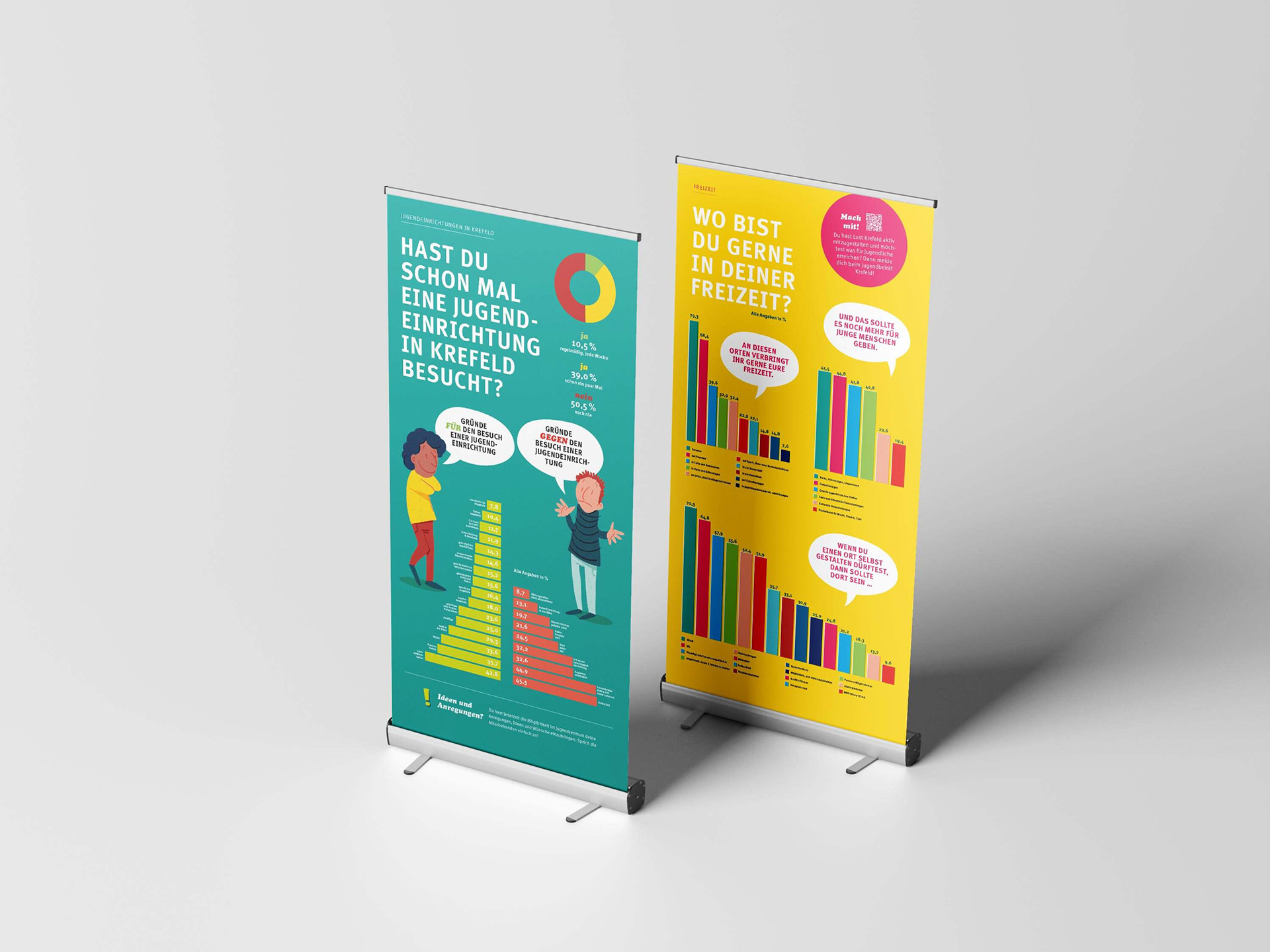 Ausstellung zu einer Jugendbefragung für die Kinder- und Jugendarbeit der Stadt Krefeld. Zehn Rollups, eine begleitende Broschüre und weitere Exponate.